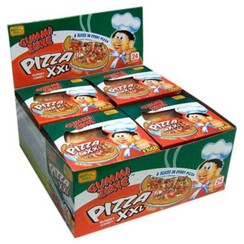 Pack de 24 grosses pizza prédécoupées et emballées individuellement (de la vraie pizza... gummi), à moins d’un euro la pizza bonbon, il ne faut pas hésiter:-). Sirop de glucose, sucre, eau, gélatine, concentré de jus de pomme, humectant, sorbitol, acidifiants acide citrique, acide lactique, protéine de lait, arômes, agents d’enrobage cire d’abeille, cire de carnauba, extraits de fruit et légume, colorants E100, E120, E150c, E171. Produit unitaire EAN 8992741902915.