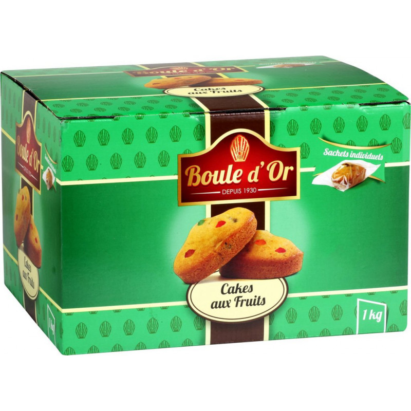 Gâteaux Cakes aux fruits BOULE D'OR. Cakes aux fruits confits et raisins secs Fruits 26% (cubes de pastèque confite 13,5% (pastèque, sirop de glucose-fructose, sucre, conservateurs: sorbate de potassium, ANHYDRIDE SULFUREUX, colorants: caramel ordinaire, E120, E133, correcteur d'acidité: acide citrique), raisins secs 11%, cubes d'écorce d'orange confite 1,5% (écorce d'orange, sirop de glucose-fructose, sucre, correcteur d'acidité: acide citrique, conservateur: ANHYDRIDE SULFUREUX)), farine de BLE, sucre, huile de colza, ŒUFS frais, sirop de sucre inverti, rhum, poudres à lever: carbonates de sodium, diphosphates (BLE), sel, arôme naturel d'orange. Peut contenir des traces de soja et de fruits à coque. Produit unitaire EAN 3288530251308.