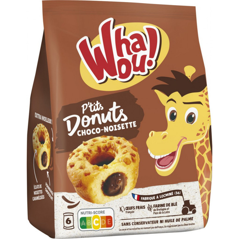 Le P'tit Donut Whaou!, un goûter ludique et gourmand pour réveiller l'espièglerie de vos enfants! A emporter partout grâce à son sachet fraîcheur. Un cœur chocolat, des éclats de noisettes caramélisées, il est préparé avec de la farine de blé 100% français et certifié, des oeufs frais et sans conservateur ni huile de palme. Ingrédients Farine de BLE 21%, huile de colza, OEUFS frais 14%, sucre, sirop de sucre inverti, stabilisant: glycérol, chocolat 5% (pâte de cacao, sucre, cacao maigre en poudre), amidons (dont BLE), NOISETTES hachées caramélisées 3,3% (NOISETTES, sucre), fructo-oligosaccharides (fibres végétales), CREME stérilisée UHT, poudres à lever: tartrates de potassium – carbonates de sodium, arôme naturel, arôme naturel de cacao, sel, gélifiant: pectines, épaississants: gomme guar – gomme xanthane. Produit unitaire EAN 3243610098914.