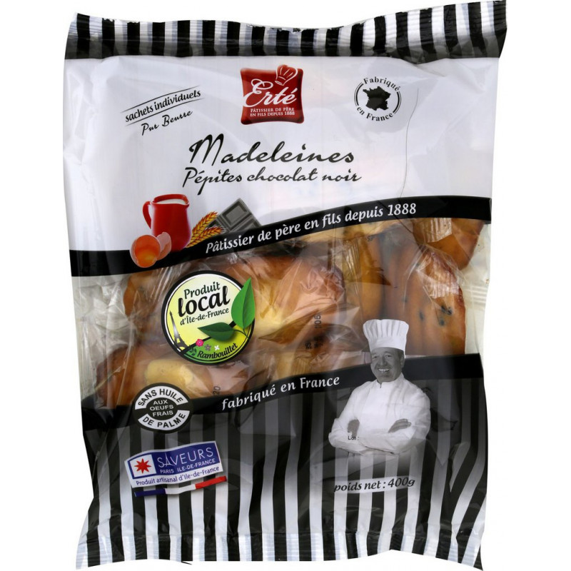 Madeleines pépites de chocolat noir. Farine de BLE, sucre, ŒUFS frais (15%), BEURRE concentré (15%), pépites de chocolat noir (10%) [sucre, pâte de cacao, beurre de cacao, poudre de cacao, émulsifiant: lécithine de tournesol], stabilisant: glycérol, sirop de sucre inverti, poudre de LAIT entier, sel, poudres à lever: pyrophosphate et bicarbonate de soude, émulsifiant: mono- et diglycérides d'acides gras, conservateur: sorbate de potassium, arômes. Atelier qui utilise des FRUITS A COQUE et des produits dérivés du LAIT. Sans huile de palme. Produit unitaire EAN 3281320034006.