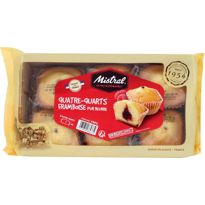 Quatre-quarts framboise. Sucre, ŒUFS FRAIS 23%, BEURRE EXTRA FIN 23%, farine de BLE 23%, fourrage framboise 15% (sirop de glucose/fructose, purée de framboises 45%, saccharose, gélifiant: pectines, acidifiant: acide citrique, correcteurs d'acidité: citrate trisodique et lactate de calcium, arôme naturel, conservateur: sorbate de potassium), humectant: glycérol, arôme naturel (contient alcool), poudre à lever, diphosphate disodique, carbonate acide de sodium, arôme, sel marin. Peut contenir des traces de SOJA et de FRUITS A COQUE. Produit unitaire EAN 3171910664334.