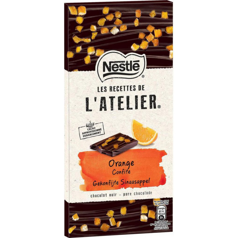 Laissez-vous séduire par notre gamme de tablettes uniques où chaque bouchée révèle un mariage de saveurs et de textures délicieusement surprenant. Pour encore plus de plaisir, savourez un produit de qualité: Chocolat extra-fin pur beurre de cacao, Fèves de cacao selectionnées et extrait naturel de vanille de Madagascar - Sans rôme artificiel. Pâte de cacao (Afrique de l'Ouest, Equateur), sucre, écorces d'orange confites 10% (écorces d'orange, sucre, sirop de glucose-fructose, arôme naturel d'orange, acidifiant (acide citrique)), matière grasse de LAIT anhydre, beurre de cacao, émulsifiant (lécithine de tournesol), arôme naturel de vanille de Madagascar. Cacao: 54% minimum. Peut contenir: ŒUF, GLUTEN, FRUITS A COQUE. Produit unitaire EAN 7613036209052.
