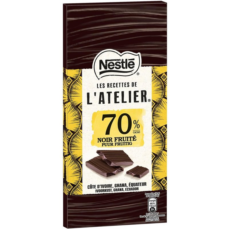 Nestlé Les Recettes de l’Atelier 70% Noir Fruité Côte d’Ivoire Ghana Équateur 100g (lot de 10)