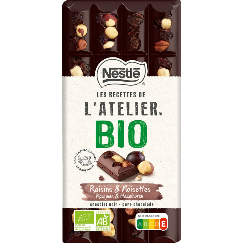 Laissez-vous tenter par nos tablettes gourmandes 100% BIO: des recettes généreuses qui vous promettent à chaque bouchée un plaisir unique. Vous ne trouverez pas deux fois le même carré dans votre tablette: chocolat noir fondant, raisins secs acidulés ou noisettes entières torréfiées.... Succombez à chacune de ces saveurs ou à leur mariage inédit pour encore plus de gourmandise. Avec le Plan Cacao NESTLE, et en partenariat avec Rainforest Alliance, NESTLE LES RECETTES DE L'ATELIER s’engage pour une production plus durable de cacao et contribue à soutenir les cultivateurs et leurs communautés. Sucre*, pâte de cacao*, beurre de cacao*, NOISETTES* (8,6%), raisins secs* (6,3%), arôme naturel de vanille de Madagascar. *Ingrédients issus de l'agriculture biologique. Cacao: 57% minimum dans le chocolat noir. Peut contenir: ŒUFS, GLUTEN, LAIT, autres FRUITS A COQUE. Produit unitaire EAN 7613287136923.