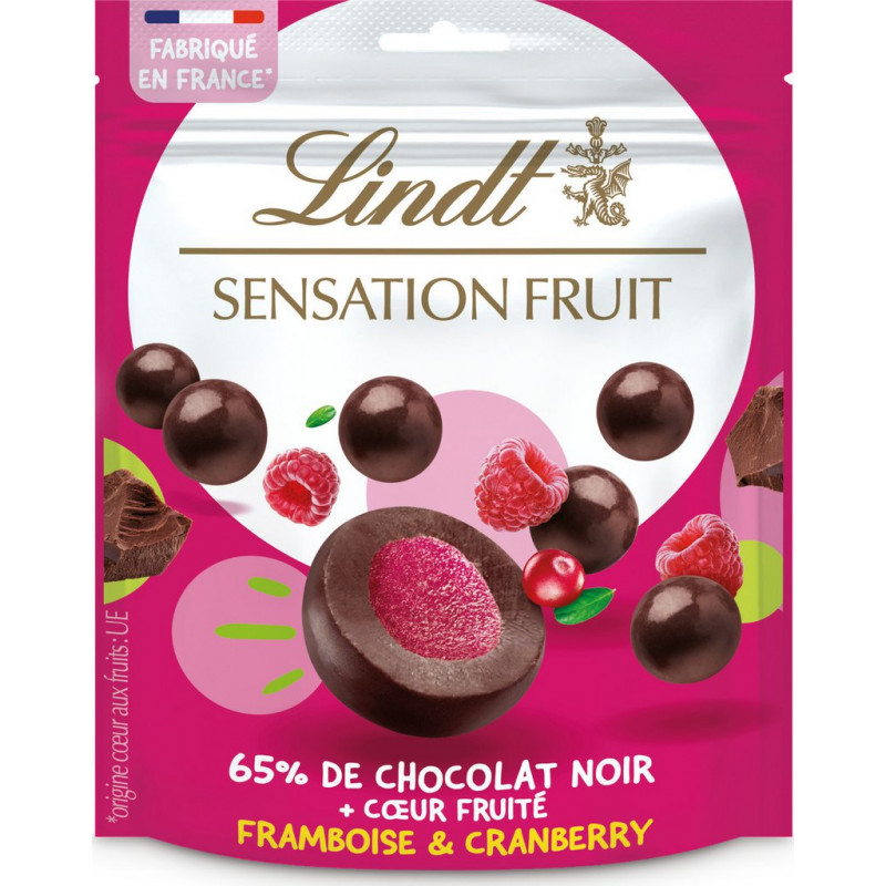 Lindt Sensation Fruit allie le bon goût des fruits et du chocolat noir pour une pause gourmande et irrésistible à tous les moments de la journée. L'association unique du fin chocolat noir Lindt et d'un cœur moelleux fruité, où la subtilité de la framboise rencontre l'exotisme de la cranberry, font de chaque bouchée un régal pour les papilles. Cœur aux fruits (purée de pomme concentrée, sirop de fructose-glucose, sirop de glucose, purée de framboise 9%, sucre, purée de canneberge 5%, fibre d’agrumes, huile de tournesol, gélifiant (pectine), acidifiants (acide malique, acide citrique), arômes naturels), sucre, pâte de cacao, beurre de cacao, beurre LAITIER concentré, agent d’enrobage (gomme arabique, shellac), émulsifiant (lécithine de SOJA), arôme. Produit unitaire EAN 3046920047883.