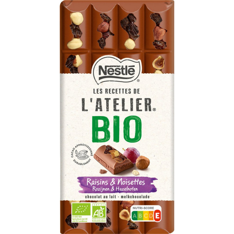 Laissez-vous tenter par nos tablettes gourmandes 100% BIO: des recettes généreuses qui vous promettent à chaque bouchée un plaisir unique. Vous ne trouverez pas deux fois le même carré dans votre tablette: chocolat au lait intense, raisins secs acidulés ou noisettes entières torréfiées.... Succombez à chacune de ces saveurs ou à leur mariage inédit pour encore plus de gourmandise. Avec le Plan Cacao NESTLE, et en partenariat avec Rainforest Alliance, NESTLE LES RECETTES DE L'ATELIER s’engage pour une production plus durable de cacao et contribue à soutenir les cultivateurs et leurs communautés. Sucre*, beurre de cacao*, pâte de cacao*, LAIT entier en poudre*; NOISETTES* (8,6%), raisins secs* (6,3%), PETIT-LAIT en poudre*. *Ingrédients issus de l'agriculture biologique. Cacao: 40% minimum dans le chocolat au LAIT. Peut contenir: ŒUFS, GLUTEN, autres FRUITS A COQUE. Produit unitaire EAN 7613287142948.