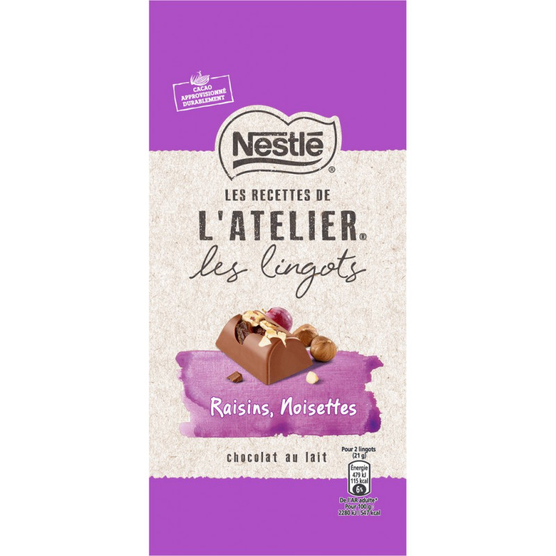 Chaque chocolat est unique! Savourez le goût intense d'un chocolat au lait fondant pur beurre de cacao relevé de fins éclats de noisettes croquants délicatement grillés et de raisins savoureux. Avec le Plan Cacao NESTLE, et en partenariat avec Rainforest Alliance, NESTLE LES RECETTES DE L'ATELIER s’engage pour une production plus durable de cacao et contribue à soutenir les cultivateurs et leurs communautés. Sucre, LAIT entier en poudre, beurre de cacao, pâte de cacao, raisins secs 8,9%, NOISETTES 6%, matière grasse de LAIT anhydre, émulsifiant: lécithine de tournesol, huile de tournesol, arôme naturel de vanille. Peut contenir: autres FRUITS A COQUE. Produit unitaire EAN 8000300401004.