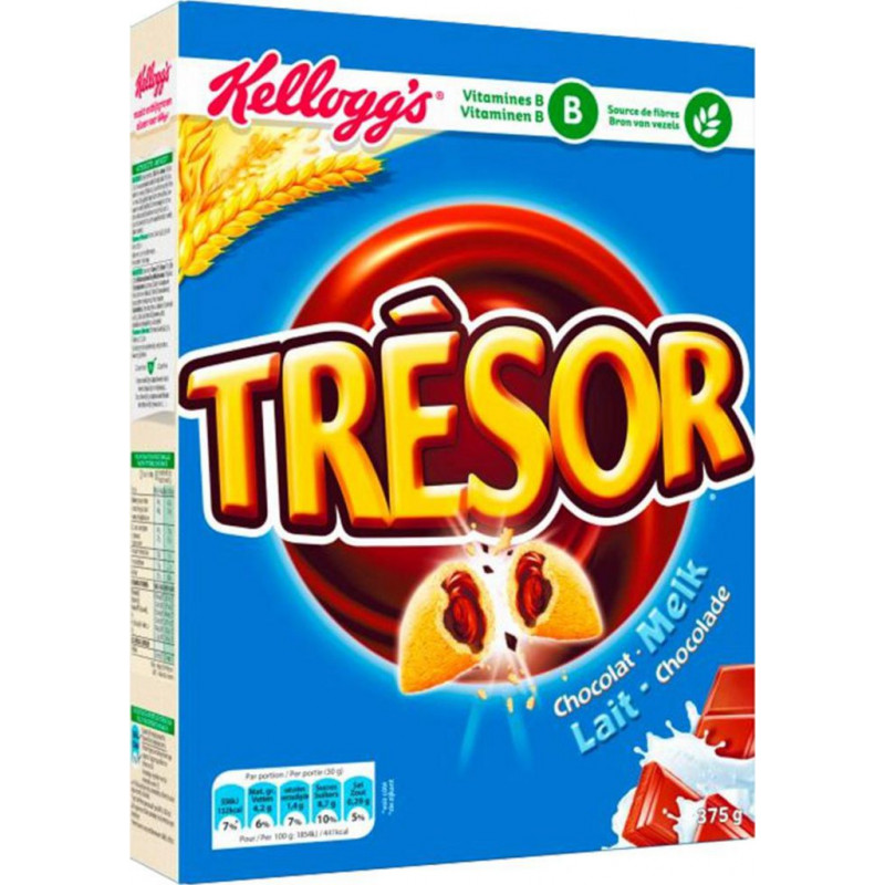 Savourez au petit déjeuner ou au goûter les délicieux Trésor Céréales fourrés au chocolat au lait. Farines de céréales Blé 69%, Avoine complète (17%), Riz (12%), Fourrage au chocolat au lait (Sucre, Huiles végétales Palme, Tournesol, Colza en proportions variables, Chocolat au lait 8,5% Sucre, Pâte de cacao, Petit-lait en poudre, Matière grasse du lait, Lait entier en poudre, Beurre de cacao}, Sirop de glucose, Cacao maigre en poudre, Lait entier en poudre, Lait écrémé en poudre, Emulsifiant Lécithine de soja), Acidifiant Acide citrique), Sucre, Sel, Colorant (Caroténoides, Rocou), Antioxydants (Palmitate d'ascorbyle, Alpha-tocophérol). Vitamines et Minéraux:Vitamines (Niacine, B6, B2, B1, Acide folique, B12) et Fer. Allergènes: voir les ingrédients en gras. Peut contenir: Fruits à coque. Produit unitaire EAN 5050083501692.