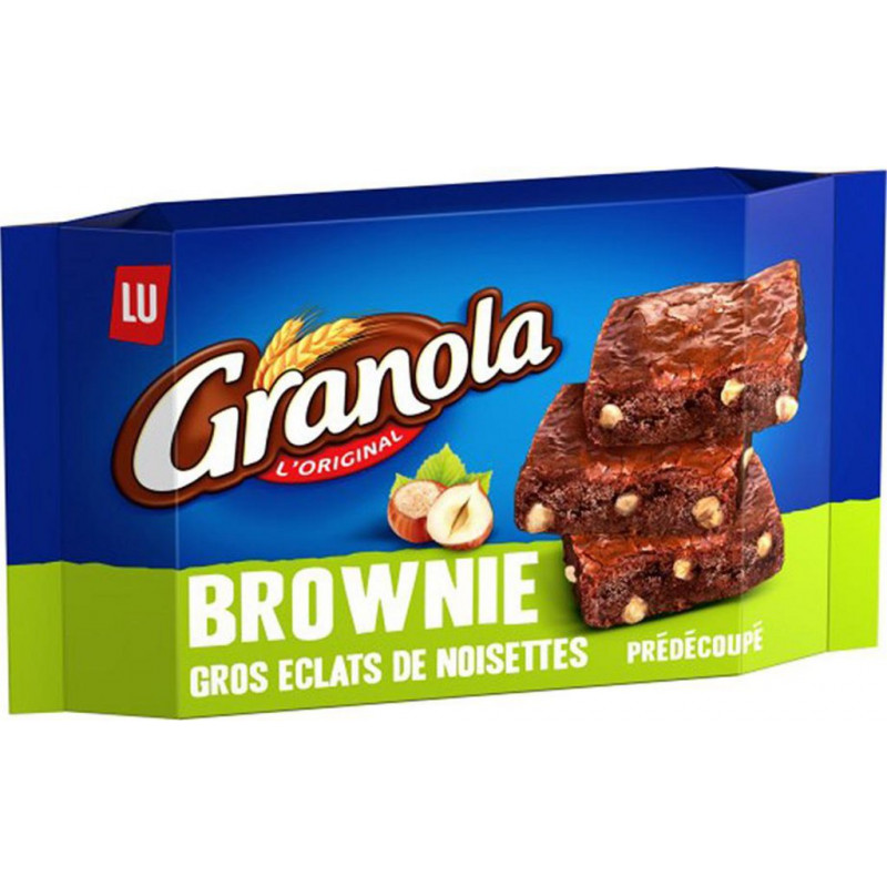 Le brownie Granola aux éclats de noisettes, un gâteau croquant et gourmand à partager au goûter! Sucre, huiles végétales (palme, colza), OEUFS, farine de BLE 10,2%, pâte de cacao, NOISETTES 5,2%, cacao maigre en poudre, sirop de glucose, dextrose, humectant (glycérol), sirop de sucre inverti, émulsifiants (E492, lécithine de SOJA, E473), LAIT écrémé concentré sucré, sel, conservateur (sorbate de potassium), correcteurs d'acidité (acide citrique, acide tartrique), arômes, amidon modifié, gélifiant (alginate de sodium), poudre à lever (diphosphate disodique, carbonate acide de sodium). PEUT CONTENIR AUTRES FRUITS A COQUE ET SESAME. Produit unitaire EAN 7622210623911.