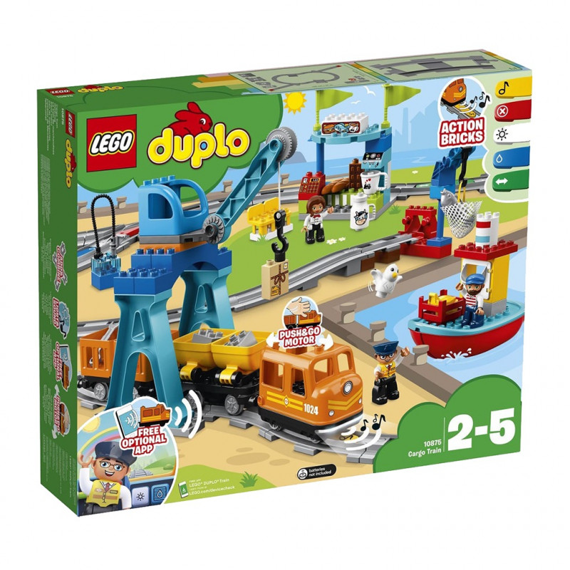 Votre enfant peut a présent contrôler et manipuler le train de marchandises LEGO® DUPLO® encore plus facilement et de différentes manieres. Les jeunes enfants peuvent incarner le conducteur du train grâce au moteur actionné par poussée: une légere pression vers l’avant ou vers l’arriere démarre le train, et pour l’arreter, il suffit de le maintenir fermement ou de le soulever des rails. Aidez votre enfant a placer les 5 briques d’action colorées le long des rails pour déclencher le klaxon, allumer ou éteindre les phares, faire une pause pour remettre du carburant, changer de direction et arreter le train ou il le souhaite. Cet ensemble LEGO DUPLO contient un port, un bateau, un café, une station de chargement, deux grues, trois figurines DUPLO et une figurine d’animal, ainsi de nombreux rails super cool pour permettre aux tout-petits d’inventer des jeux sur le theme intemporel des trains. Deviens le nouveau conducteur de train grâce à LEGO Duplo 10875. Tu dois amener ta marchandise à bon port. La grue est prête pour le déchargement. Produit unitaire EAN 5702016117271.