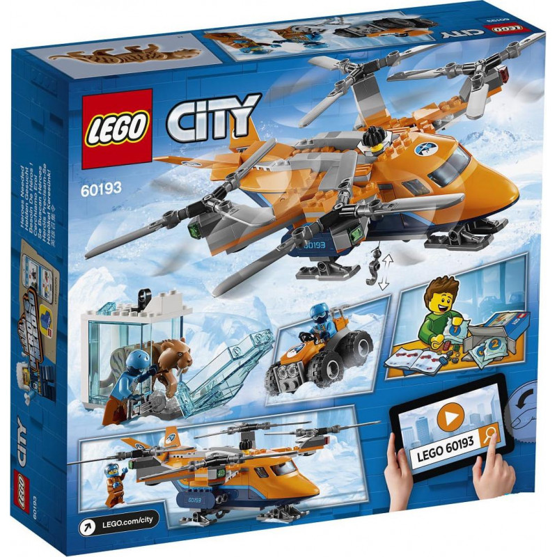 Composition de la boîte LEGO City - L'hélicoptère artique: 2 figurines d’explorateurs LEGO®: un grimpeur et un pilote arctiques ainsi qu’une figurine de tigre à dents de sabre préhistorique « glacé ». Comprend un hélicoptère de transport avec 4 rotors qui tournent, un train d’atterrissage à skis et un élévateur qui fonctionne avec une corde et un crochet, ainsi qu’un véhicule tout-terrain. Inclut également un bloc de glace bleu transparent avec un système de verrouillage pour le crochet sur la partie supérieure et de l’espace à l’intérieur pour la figurine de tigre à dents de sabre « glacé ». Accessoires inclus: 2 pioches et une scie. L'hélicoptère est prêt à décoller: les hélices se mettent à tourner. Le véhicule tout-terrain se rend jusqu'au site de fouille et guide l'hélicoptère pour arriver sur les lieux. Le crochet permet d'attraper le bloc de glace et de le ramener à la base. L'hélicoptère mesure plus de 8cm de haut, 25cm de long et 30cm de large. Le véhicule tout-terrain mesure plus de 5cm de haut, 7cm de long et 5cm de large. Le bloc de glace mesure plus de 7cm de haut, 3cm de large et 8cm de profondeur. L’hélicoptère arctique LEGO City 60193 est fait pour toi! Une découverte a été faite en haute montagne! Il s'agirait d'un bloc de glace. L'hélicoptère va tenter d'accéder en mode vol stationnaire pour faire descendre le crochet jusqu'à l'objet mystérieux. Il pourra alors être transporter jusqu'au camp de base afin d'être examiné! Produit unitaire EAN 5702016109467.