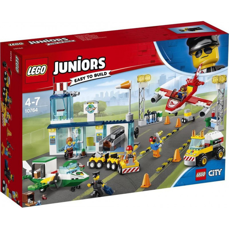 Inclut 5 figurines: 2 pilotes, 2 employés d’aéroport et un touriste. Comprend un terminal d’aéroport avec un élément mural et une plaque de base Starter Brick, une porte qui s’ouvre, une tour de contrôle, une antenne parabolique, une manche à air et un tapis roulant pour bagages qui fonctionne vraiment, un système d’éclairage avec des zones pour les outils et 4 pistes d’atterrissage à construire. Inclut également 2 avions avec des bases Starter Brick, un avion-cargo avec des hélices qui tournent et un compartiment cargo, un avion de ligne avec une cage d’escalier, un camion-citerne avec une base Starter Brick et un chariot à bagages avec 2 remorques amovibles. Accessoires inclus: 4 cônes orange, une clé à molette, une baguette lumineuse de placement, un appareil photo, une burette, un billet d’avion, un paquet, 3 valises, une grue, 3 pierres précieuses, un casque, une mallette, un croissant et un talkie-walkie, ainsi que 4 pistes d’atterrissage à construire et un chariot de transport de carburant. Les valises et les paquets sont prêts à être chargés sur le tapis roulant. Tourner la molette peremt de les acheminer vers le chariot à bagages. Les bagages et les paquets sur le chariot peuvent être transportés jusqu’aux avions. Les hélices de l’avion-cargo tournent pour décoller et livrer les marchandises. Il ne reste plus qu'à se préparer pour le décollage! Les ensembles LEGO® Juniors incluent des modèles faciles à construire avec des bases Starter Brick, ainsi qu’un guide simple pour apprendre rapidement aux enfants à construire et à jouer. Les jouets de construction LEGO® Juniors sont compatibles avec tous les autres ensembles de construction LEGO pour une construction créative. Le terminal de l’aéroport mesure plus de 15cm de haut, 19cm de large et 6cm de profondeur. L’avion-cargo mesure plus de 5cm de haut, 13cm de long et 14cm de large. L’avion de ligne mesure plus de 7cm de haut, 13cm de long et 14cm de large. Le chariot à bagages avec 2 remorques mesure plus de 3cm de haut, 13cm de long et 3cm de large. Chouette! C'est les vacances! Pars pour l'aéroport de LEGO City Central 10764. Fais l'enregistrement de tes bagages et monte dans l'avion. Bonjour, ici le commandant de bord. Décollage immédiat! Produit unitaire EAN 5702016117639.