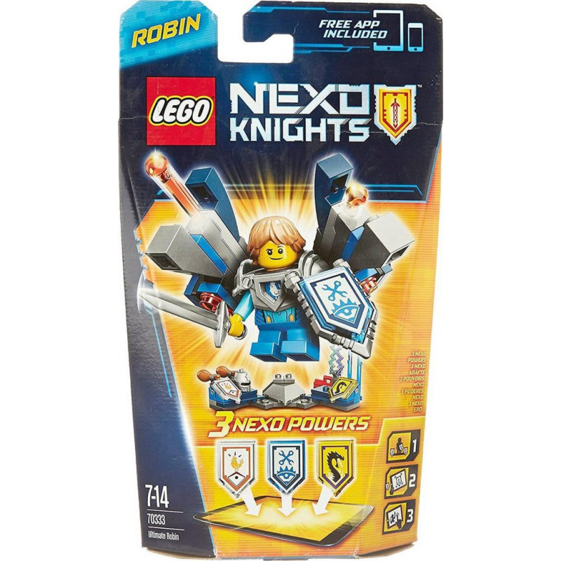 Le chevalier Ultime Robin est seulement dans sa première année à l'Académie des chevaliers mais il a une ultra armure robotique très spéciale! Transformez ce fusil à ressorts impressionnant en jambes de robot pour grandir. Frappez les opposants avec les projectiles de décharge statique ou sois fourbe et lancez des cuisses de poulet sur l'ennemi! Augmentez vos talents de combat en scannant les écussons pour obtenir 3 NEXO pouvoirs pour votre collection numérique de capacités uniques pour vaincre Jestro et les maléfiques monstres de lave dans l'application gratuite LEGO NEXO KNIGHTS: MERLOK 2.0. Scanne les 3 NEXO pouvoirs: Maître du robot, Pouvoir du poulet et Dragon de tempête. Le chevalier Ultime Robin fusionne action réelle et réalité augmentée avec 3 écussons à scanner pour obtenir des NEXO pouvoirs uniques pour le jeu numérique. Les armes incluent 2 fusils à ressorts avec un missile supplémentaire et une épée. Les accessoires incluent 2 os de poulet, 2 projectiles de décharge statique, une boîte à outils, un casque et un support. Transformez les fusils à ressorts de l'ultra armure en jambes de robot! Inclut une figurine du chevalier Ultime Robin. Mesure plus de 6cm de haut. Nombre de pièces: 75. Soyez le meilleur au tir avec le chevalier Ultime Robin et son armure robotique! Produit unitaire EAN 5702015594424.