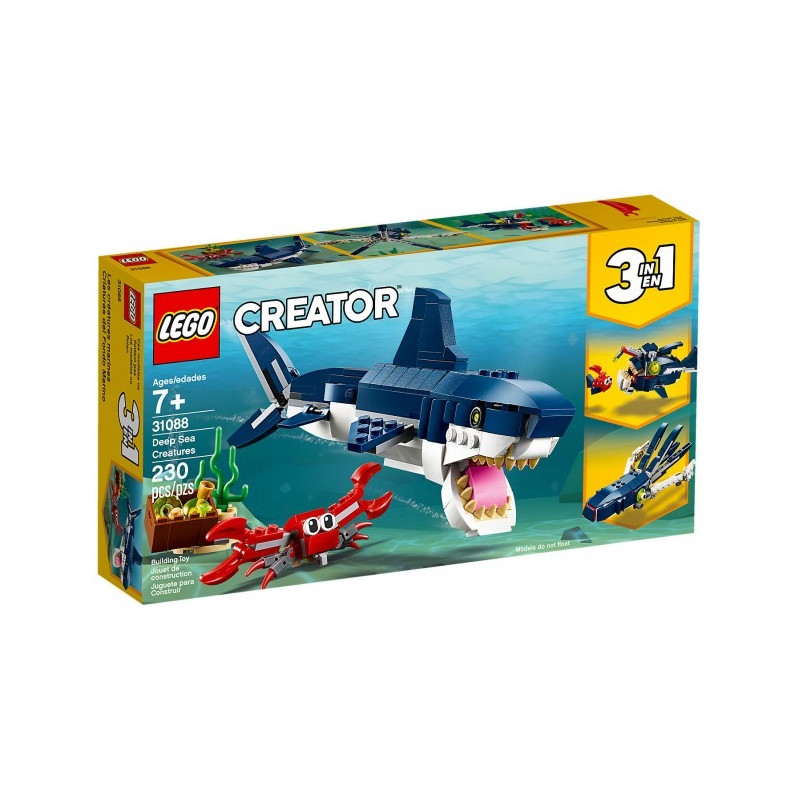 Profitez des aventures sous la mer avec l’ensemble Les créatures sous-marines LEGO® Creator 3-en-1 31088, comprenant un requin effrayant avec des coloris bleu foncé et blancs, une bouche ouverte pleine de dents pointues, des ailerons mobiles, des articulations mobiles et des yeux réfléchissants, ainsi qu'un crabe mobile muni d'une boîte au trésor. Avec les ensembles LEGO Creator 3-en-1, il est possible d'obtenir 3 expériences de construction et de jeu différentes. Construisez le requin et le crabe puis transformez-les pour créer un calamar mobile ou une baudroie avec une grande bouche pour encore plus de plaisir en milieu sous-marin. Permet d'avoir 3 possibilités de construction avec cet ensemble 3-en-1 LEGO® Creator. Un moyen de réaliser un requin avec un crabe, un trésor ainsi que la possibilité de créer un calamar ou une baudroie avec une bouche géante. L’ensemble Les créatures sous-marines comprend un requin effrayant avec une bouche qui s'ouvre, des dents pointues, des ailerons mobiles, des articulations mobiles et des yeux réfléchissants, ainsi qu'un crabe avec une boîte au trésor. Coloris bleu foncé et blancs du requin! Possibilité d'ouvrir la bouche du requin pour révéler ses dents pointues effrayantes. Un crabe très mignon et sa boîte au trésor. Une construction supplémentaire avec cet ensemble. Instructions de montage pour une baleine disponible sur LEGO.com. Le requin mesure plus de 8cm de haut, 21cm de long et 9cm de large. Le crabe mesure plus de 3cm de long et 11cm de large. Le calamar mesure 4cm de haut, 18cm de long et 22cm de large. La baudroie mesure plus de 5cm de haut, 14cm de long et 8cm de large. Une véritable moyen de construire et reconstruire un requin, un calamar ou une baudroie avec cet ensemble Les créatures sous-marines LEGO® Creator 3-en-1. Produit unitaire EAN 5702016367836.